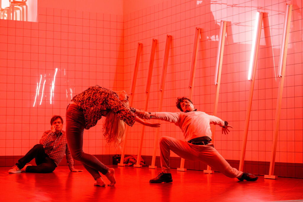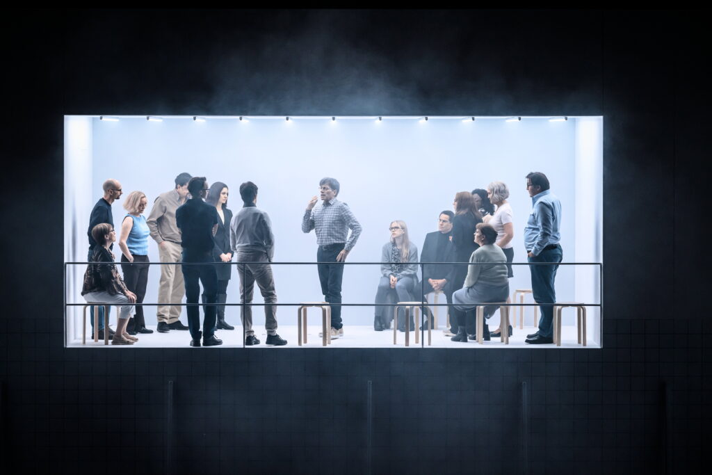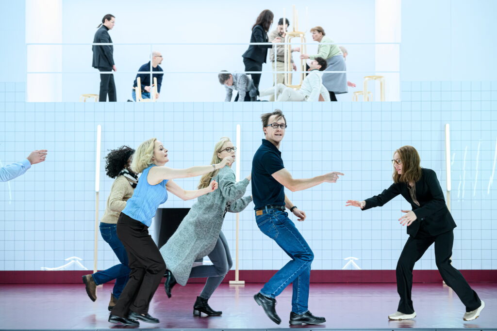 Izrādes dalībnieki ir atlasīti tā, lai reprezentētu dažādus sabiedrības pārstāvjus vecuma, dzimuma un ādas krāsas ziņā. Kustību partitūra variē kolektīvo un individuālo, te ir gan kopēja virzība pa apli, gan divu līniju sastapšanās, gan darbības ar gaismas ķermeņiem, veidojot vizuālas zīmes. Taču ir arī fragmentāri solo, pāru vai nelielu grupu sinhronu kustību uzplaiksnījumi, un ir ķermeņu mijiedarbība fiziskā teātra koordinātās. Paradokss ir tas, ka, jau pēc izrādes noskatīšanās vēlreiz pārlūkojot attēlus un videotreileri, rodas iespaids, ka tā patiešām ir “tīra” dejas izrāde, taču teksts ar savu apjomu tomēr lielā mērā kustību pakārto sev. Vairākas reizes, kad sākas kāda kustība, kas ieviļņo vēl citu performantu ķermeņus, liekas, ka nu gan būs ilgāks, no teksta atbrīvots dejas fragments, tomēr tas atkal apsīkst.