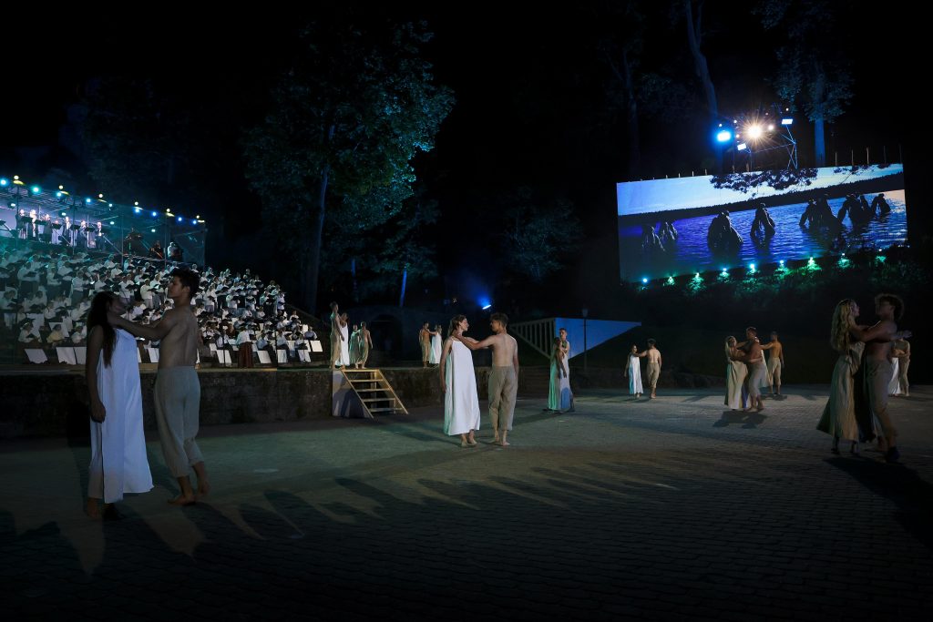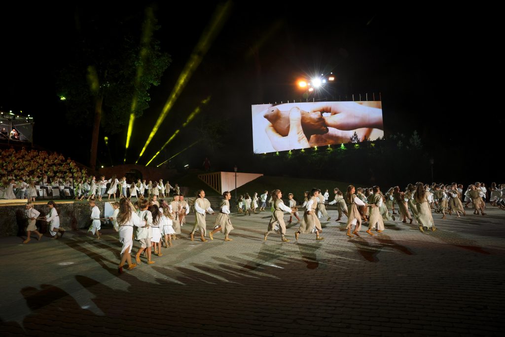 Jau deju uzvedumā “Balts” 2023. gadā Reinim Rešetinam līdz ar tēlainajām un horeogrāfiski ietilpīgajām intermedijām izdevās radīt spēcīgu caurviju kustību stāstu tematiskajam koncertam. Taču uzvedumā “Māls” Rešetins ir bijis jūtīgs un gudrs “virpriesteris” (deju mākslinieciskais vadītājs) – uzveduma deju horeogrāfiju autori ir arī novada kolektīvu vadītāji Lāsma Skutāne, Andis Kozaks, Patrīcija Zemniece, Paula Anna Āboliņa, Sandra Bārtniece, Evija Bišere un Māris Brasliņš. Tāpat sava īpaša telpa atvēlēta Artūram Nīgalim, kas Māla lomā ir gan aktieris- dejotājs, gan horeogrāfijas autors. Lai gan uzvedumā horeogrāfiju veidojuši deviņi horeogrāfi, kustību valodai ir vienots raksts un mērķtiecīgs raksturs. Katram no horeogrāfiem acīmredzot bijis iedots precīzs uzdevums, kas realizēts ar atbilstoši varošiem un gibošiem dejotājiem. Pirts, talka, rotaļas, uguns vai ūdens deja – katrai no uzveduma dejām bijusi paredzēta sava vieta, laiks un jēga kopējā uzveduma horeogrāfijā. Bija prieks vērot šos priekšnesumus, ko ar azartu un apzinību izpildīja dažāda vecuma grupas. Horeogrāfi lieliski iztikuši bez īpašiem ģeometriskiem laukuma zīmējumiem un brīžiem dejas iestudējuši vienkārši organizētas grupās. Nav iespējams pateikt, kuru no dejām te gribētos izcelt, jo drīzāk jūtu vēlmi to visu noskatīties vēlreiz no sākuma līdz beigām. Gribētu atkal redzēt gan mazos bērniņus putnu dziesmās un rotaļās, gan baltos, skaistos tīņus (“Balabaska”), gan jaunās meitenes uz mucām (“Pagalms. Mīdeklis”) un tautas tērpu dailē, nākot pa pils parka kāpnēm (ievadot daļu “Māla rotas”). Pat asprātīgās ķieģeļcepļa kolonnu dejas (“Būvceplis”) organiski ievijās uzveduma poētiski ievirzītajā atmosfērā. To lieliski papildināja arī video mākslinieku Mārtiņa Purmaļa un Lauras Čaupales darbs, vakara izrādes norises Pils parkā savienojot ar filmējumiem citās vietās (karjerā, ceplī, ezerā u.c.). Atsevišķos momentos šis tas varbūt arī šķita pārāk ilustratīvi – piemēram, “Amatniecības” daļā ekrānā redzamas dažādas darbības un aktivitātes ar mālu, bet to visu izteiksmīgi “paskaidro” vēl Viļa Daudziņa balss.