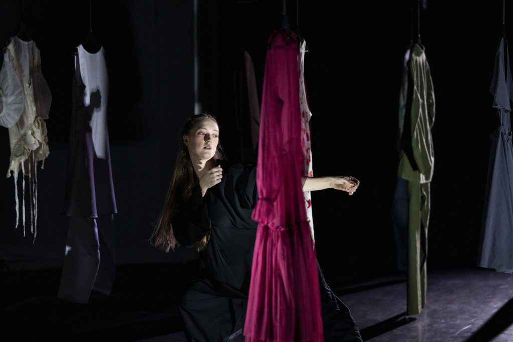 Tērpi griežas un virpuļo ap savu asi – zinot Alises iepriekšējos darbus un viņas interesi par griešanās kustību, to lasu kā nākamo aizraujošo soli viņas kustību izpētē. Nemērīju, vai otrā izrādes daļa bez cilvēka ķermeņa līdzdalības ir garāka nekā pirmā, taču tā noteikti šķita ietilpīgāka un ar lielāku potenciālu. Skatīšanās uz to, kā kustas un dejo lietas, šai gadījumā – tērpi, ir pieredze, kurā laika ritējums un pat zināma vienmuļība un atkārtojums ļauj iztēlei un uzmanībai atvērties ārpus ikdienišķā. To, šķiet, zina ikviens, kas bērnībā gulējis pļavā, vērojot debesīs slīdošos mākoņus un to pārvēršanos dažnedažādās formās un tēlos.