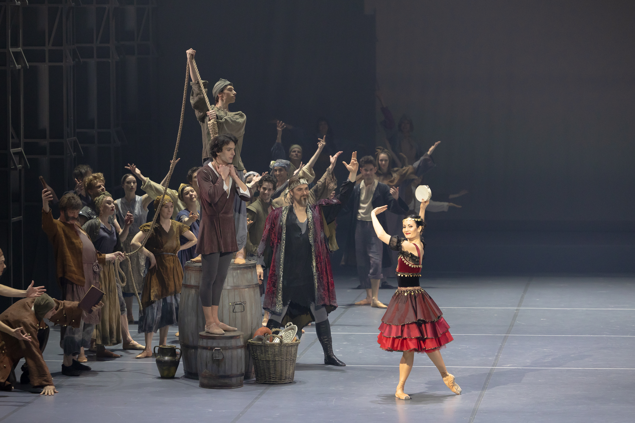 Pirmajā cēlienā skatuves apgaismojums koncentrēts proscēnijā, kurš tiek izmantots reti. Klaidoņu un ubagu dejā mākslinieki uz mirkli apstājas skatuves priekšplānā un ļauj skatītājam novērtēt stilizētā un detaļās bagātīgā viduslaiku pūļa kolorītu, ko mūžīgajā masu skatu kustībā izjust ir grūti. Kopumā kordebalets “Esmeraldā” šķiet aizmirsts – tā izpildījumu un horeogrāfiju jo īpaši gribētos redzēt Flērdelisas de Gondelorjē un viņas saderinātā Fēba de Šatopēra adagio laikā otrajā cēlienā, kurā uzmanība nemitīgi lēkā starp dejotāju grupām un solistiem, rezultātā neļaujot īsti novērtēt ne vienus, ne otrus.